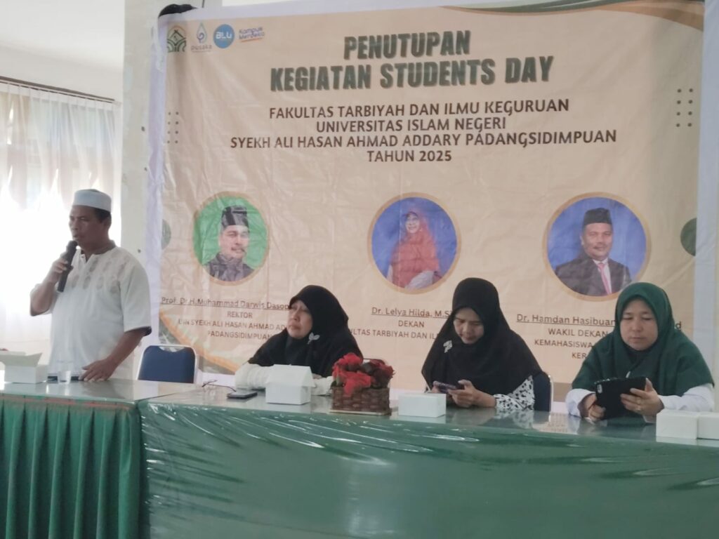 Acara penutupan Student’s Day hari ini turut dimeriahkan dengan berbagai penampilan menarik, serta mendapatkan apresiasi yang luar biasa dari seluruh sivitas akademika Fakultas Tarbiyah dan Ilmu Keguruan UIN Syahada Padangsidimpuan, menandai berakhirnya rangkaian kegiatan yang inspiratif ini.